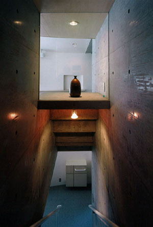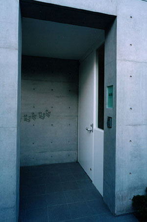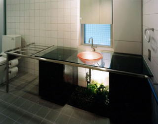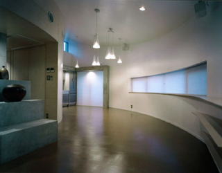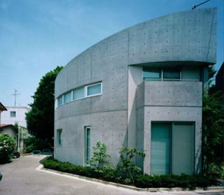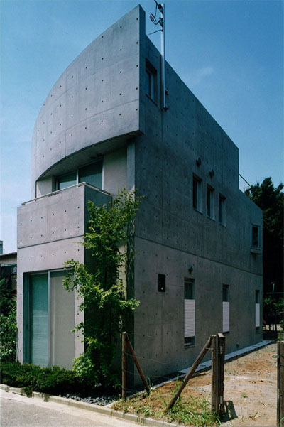 南側道路より 敷地に合わせて曲線を描く外壁のラインがよくわかります 玄関には音楽教室をされているので、壁面に音符が打込まれています 階段より ガラスの洗面器が強化ガラスに埋めこまれています リビング、外壁の曲線がそのままいかされています